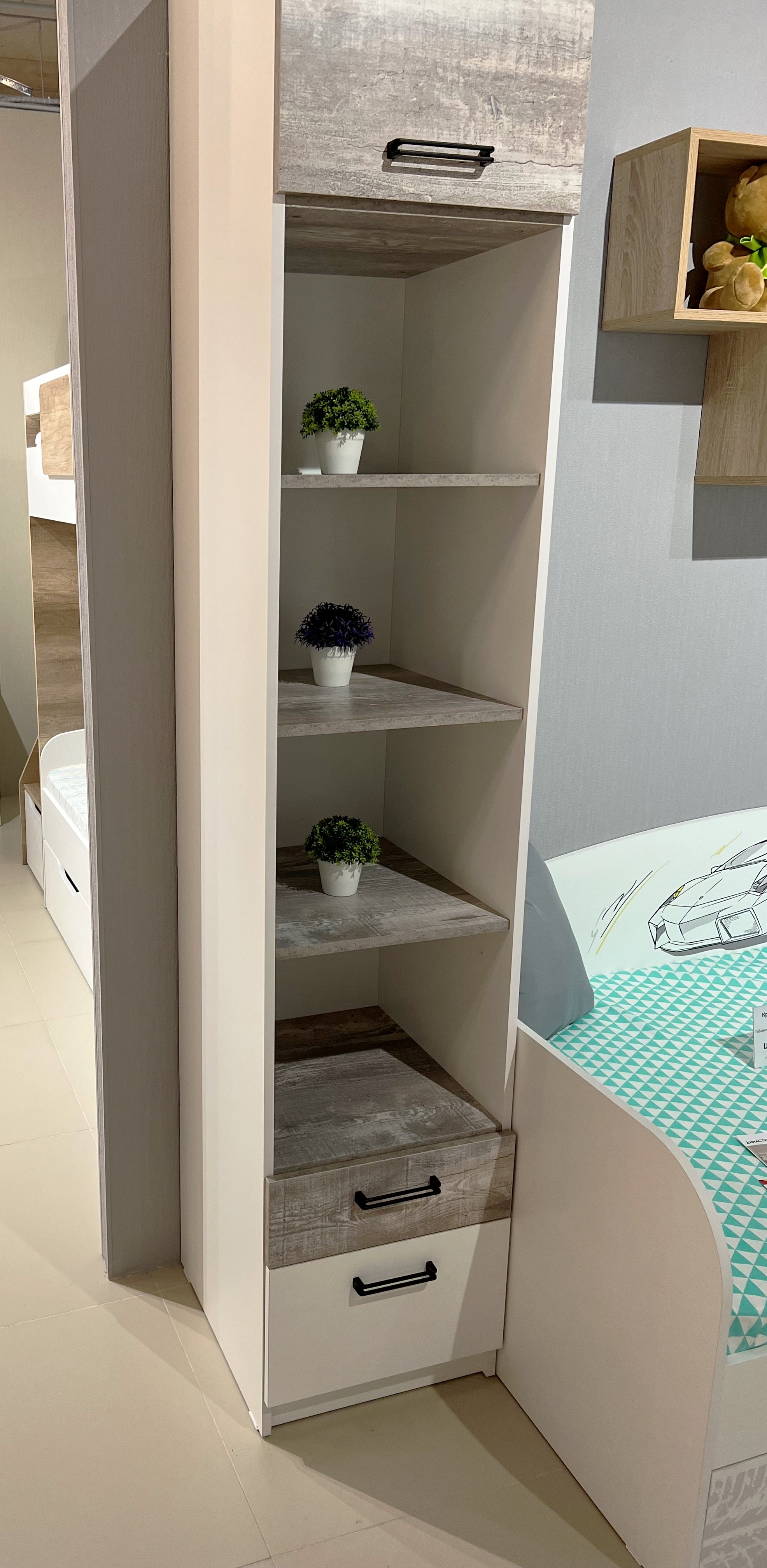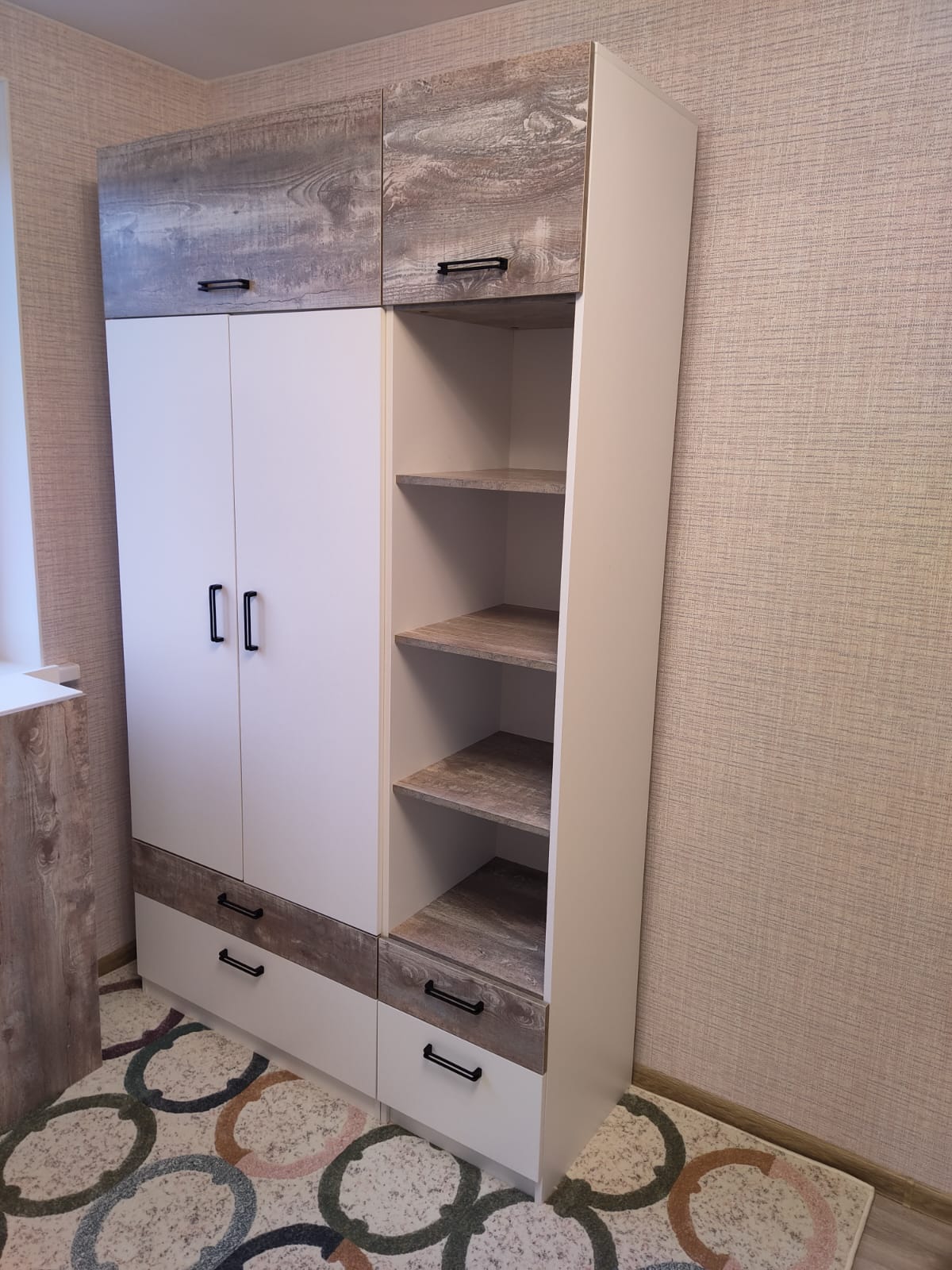 Мебель выполнена из сертифицированного, качественного, экологически чистого ЛДСП в сочетании цветов "бетон пайн" + белый.
