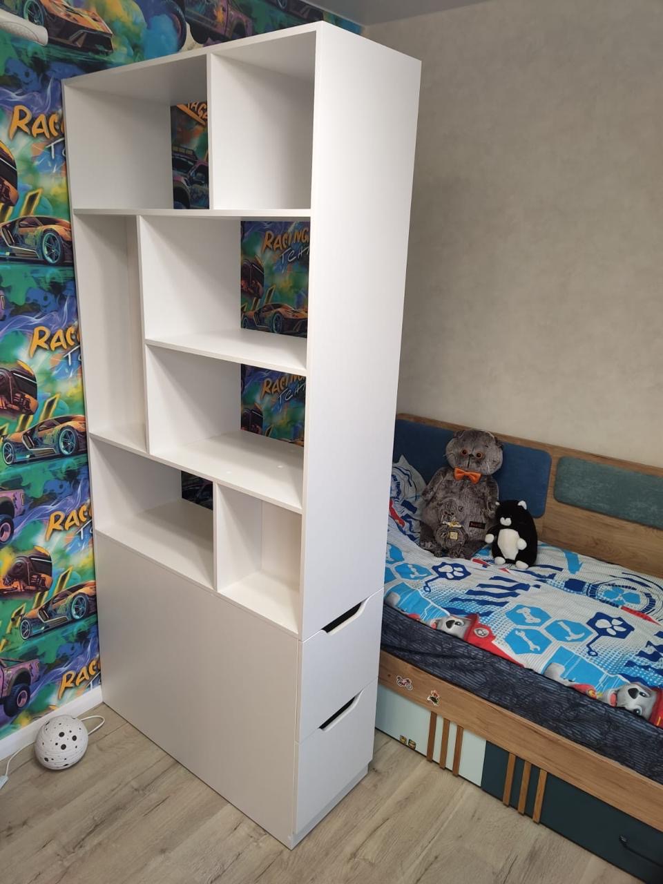 <comment>Просто шикарный стеллаж для создания зонирования! Подкупили сразу вместительные выдвижные ящики. Очень функционально. Кровать тоже отличная! Спасибо вам </comment>