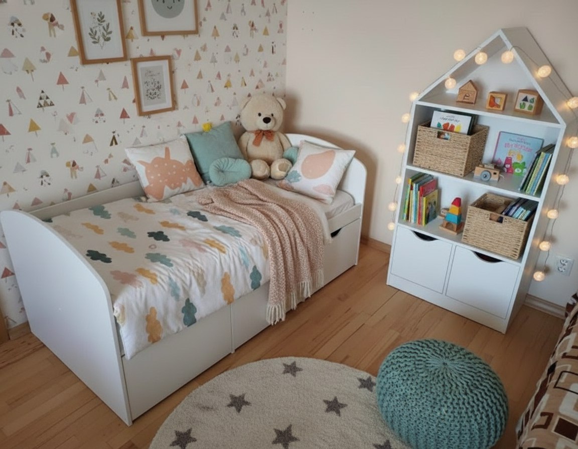 Стеллаж в виде домика - оригинальное и практичное дополнение в интерьере детской комнаты.
