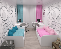 - Отдельная кровать для каждого ребенка. Например, в комнате можно установить две кровати одинакового размера, но разного цвета или стиля. Также можно рассмотреть возможность использования двухъярусных кроватей, у которых одно спальное место и дополнительные модули (рабочее место, зона для хранения вещей и др.).