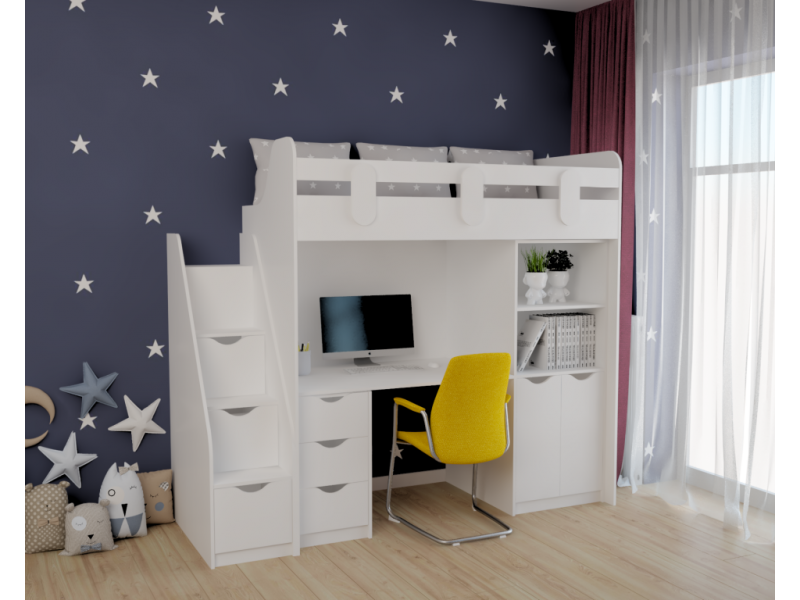 С письменным столом и полноценным рабочим пространством. Комплектация для школьников. Под спальным местом расположен рабочий стол. В некоторых моделях предусматривается установка компьютерного стола с выдвижной полкой для клавиатуры. Ящики и полки позволяют удобно разместить учебники, тетради, письменные принадлежности и другие аксессуары.